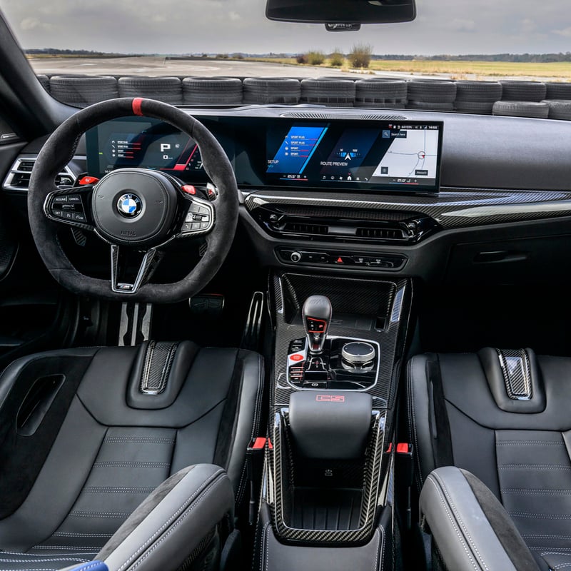 Dès l’ouverture des portes, l’atmosphère orientée performance est évidente. Les sièges baquets M en carbone, chauffants et allégés, sont habillés de cuir Merino noir avec inserts M tricolores et logo “CS” rétroéclairé. Les appuie-têtes sont démontables pour le port du casque, et la compatibilité avec les harnais multipoints est prévue.